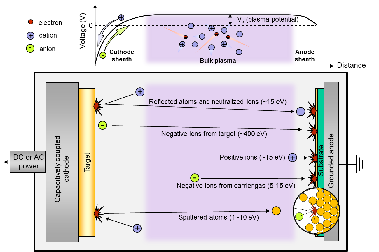 图1可能对衬底上生长中的薄膜造成损伤的高能粒子示意图。上图展示了靶材与衬底之间的电压随距离的变化关系。