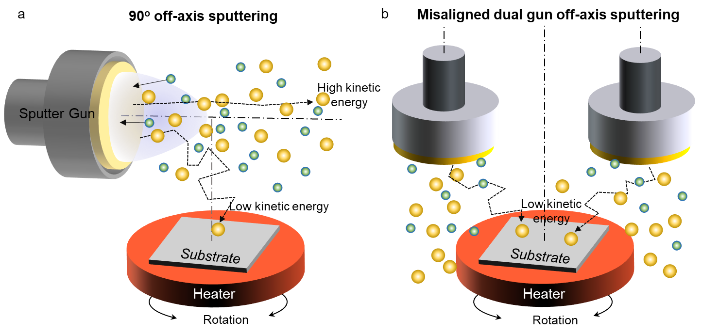 离轴构型(如90°构型和错位双枪系统)从根本上改变了溅射通量的动能分布。通过将入射粒子的轨迹重定向为扩散型低能轨迹,这些设计显著降低了轰击损伤,抑制了挥发性组分的再蒸发,并提升了界面平整度。双枪结构进一步弥补了90°离轴溅射通常存在的沉积速率降低的问题,实现了与工业级晶圆尺寸兼容的均匀、可规模化生长。这些创新表明,溅射几何构型并非固定约束,而是可调控的自由度,能够拓展氧化物外延生长的可达相空间与结构空间。