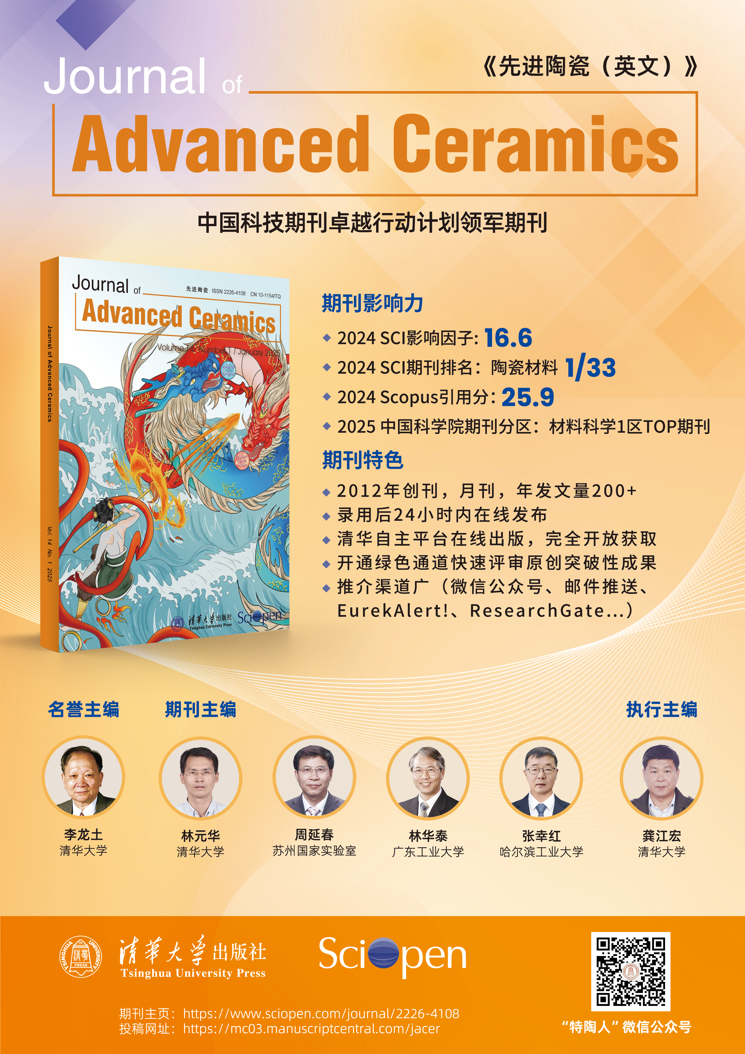《先进陶瓷(英文)》于2012年创刊,清华大学主办,清华大学出版社出版,清华大学新型陶瓷材料全国重点实验室提供学术支持,创刊主编为中国工程院院士、清华大学李龙土教授,主编为中国科学院院士、清华大学林元华教授、苏州国家实验室周延春教授、广东工业大学林华泰教授和哈尔滨工业大学张幸红教授。该刊主要发表先进陶瓷领域的高质量原创性研究和综述类学术论文,涉及先进陶瓷的制备、结构表征、性能评价的各个细节,尤其侧重新材料研制和先进陶瓷基础科学研究等重要方面,致力于在世界先进陶瓷领域搭建学术交流平台,引领和促进先进陶瓷学科的发展。已被SCIE、Ei Compendex、Scopus、DOAJ、CSCD等数据库收录。现为月刊,2025年发文量为202篇;2025年6月发布的影响因子为16.6,连续5年位列Web of Science核心合集“材料科学,陶瓷”学科33种同类期刊第1名;2024年11月入选“中国科技期刊卓越行动计划二期”英文领军期刊项目;2025年入选中国科学院文献情报中心期刊分区表材料科学1区Top期刊。2023年起,本刊结束与国际出版商的合作,改由清华大学出版社自主研发、拥有自主知识产权的科技期刊国际化数字出版平台SciOpen独家发布,标志着该刊结束多年来“借船出海”的办刊模式,回归本土独立运营,也是我国优质英文期刊中最早回归国产平台的期刊之一。